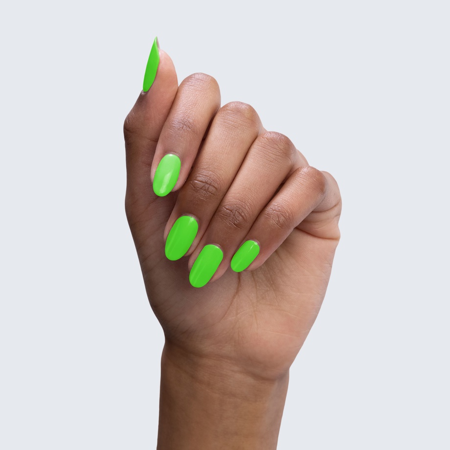 Neon green. Bright. Cool undertone. Medium opacity (slightly translucent).