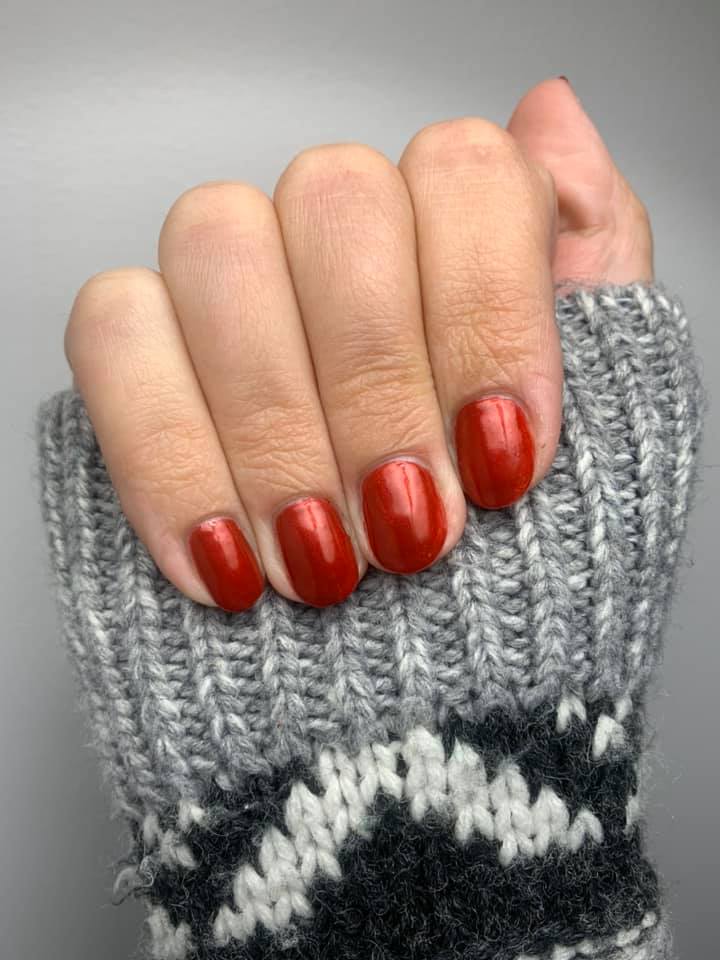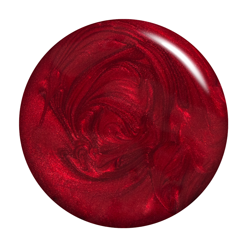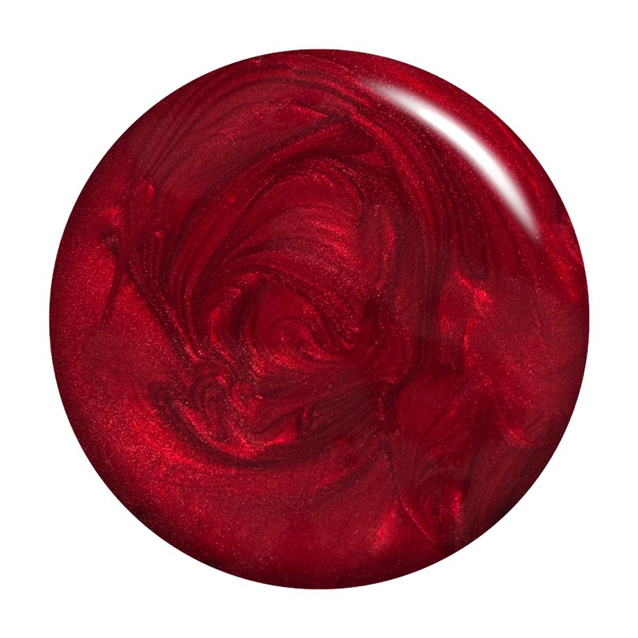 Scarlet red. Deep. Pearl finish. Opaque. Warm undertone.